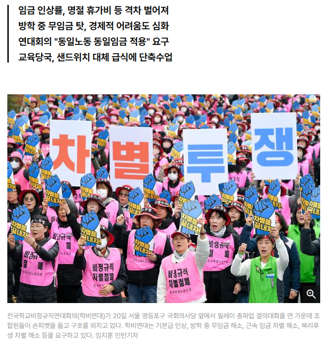 [경향신문] 학교 급식·돌봄 노동자 ‘릴레이 총파업’