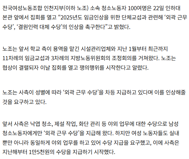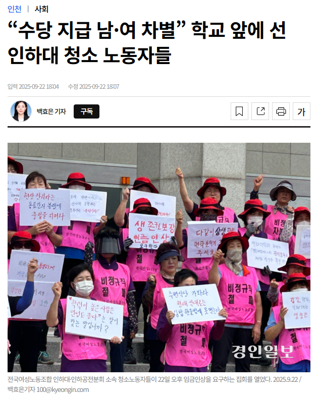 [경인일보] “수당 지급 남·여 차별” 학교 앞에 선 인하대 청소 노동자들