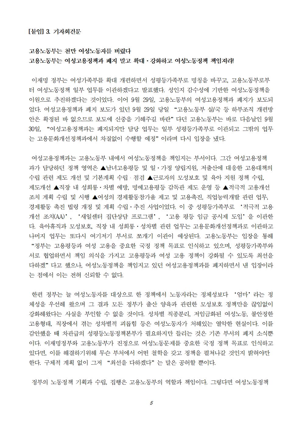 [보도자료] 여성고용정책과 폐지 규탄 및 여성노동정책 확대개편을 위한 기자회견