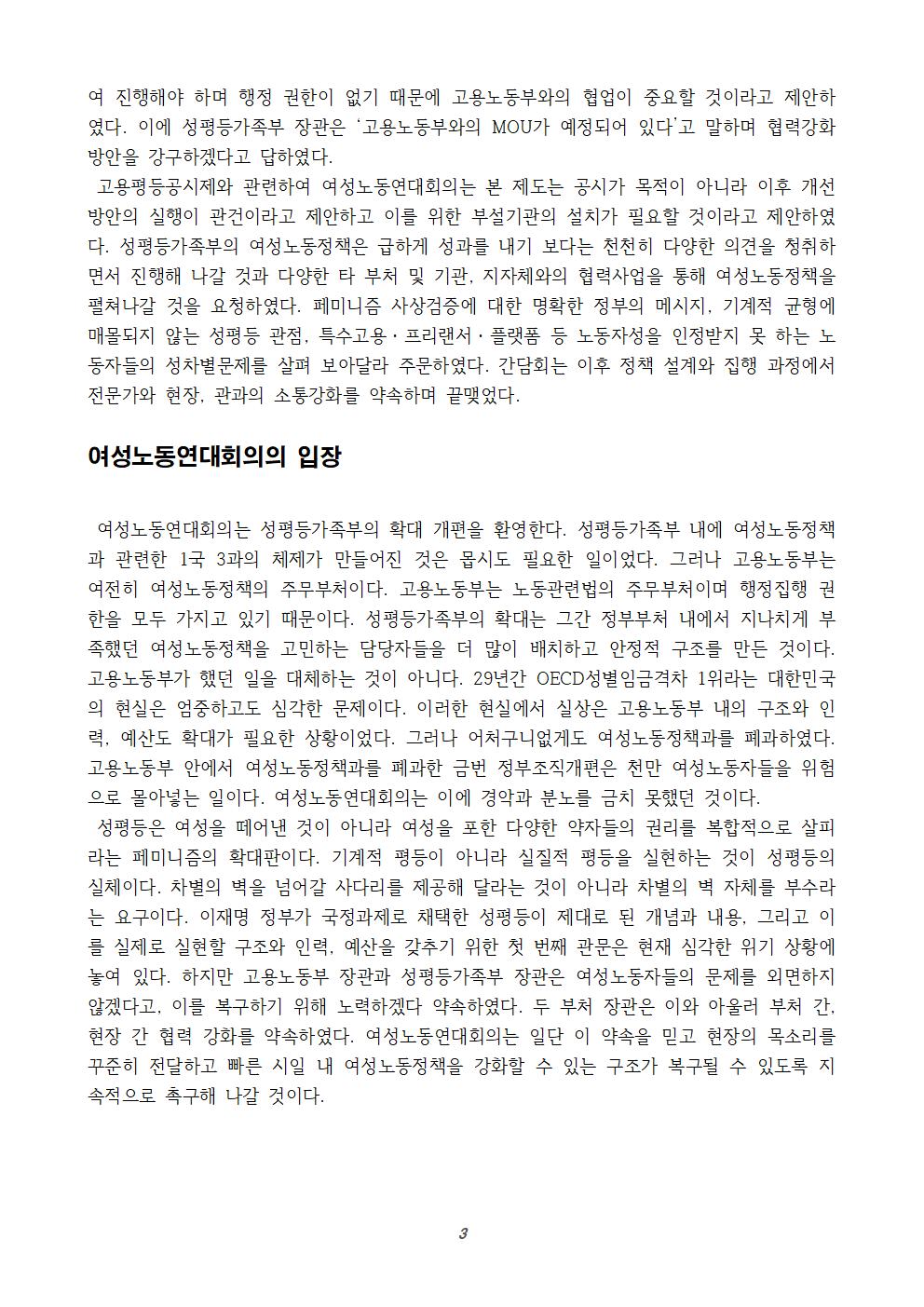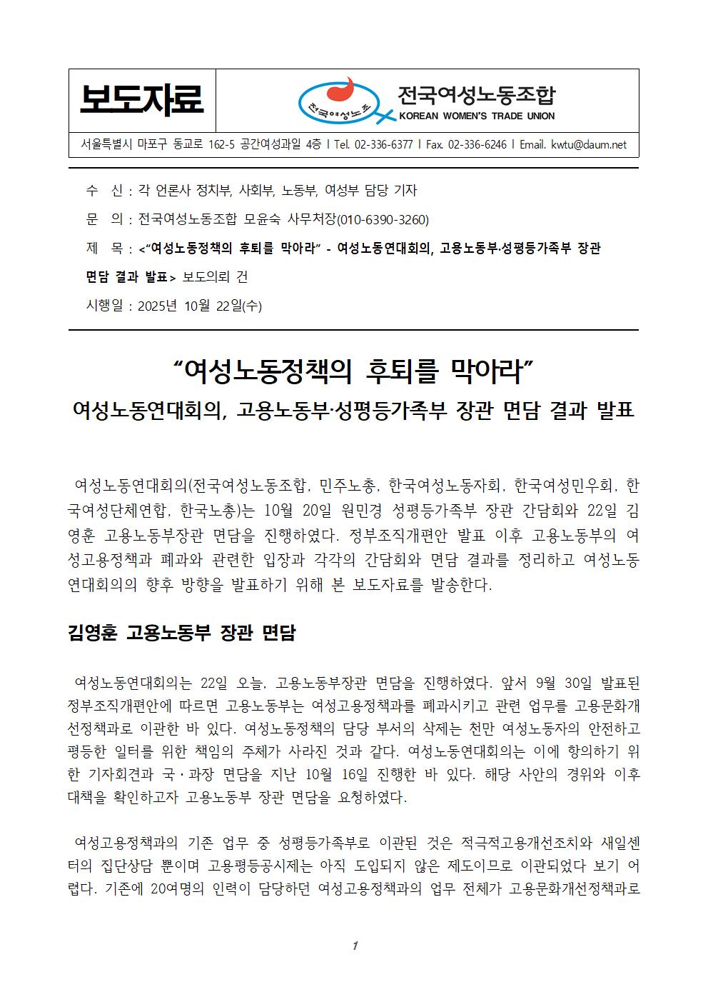 [보도자료] “여성노동정책의 후퇴를 막아라”- 여성노동연대회의, 고용노동부·성평등가족부 장관 면담 결과 발표