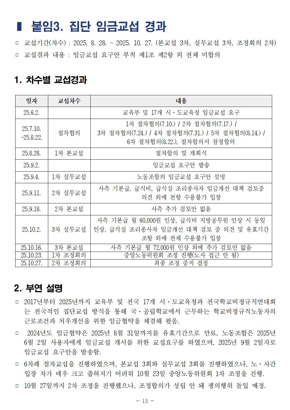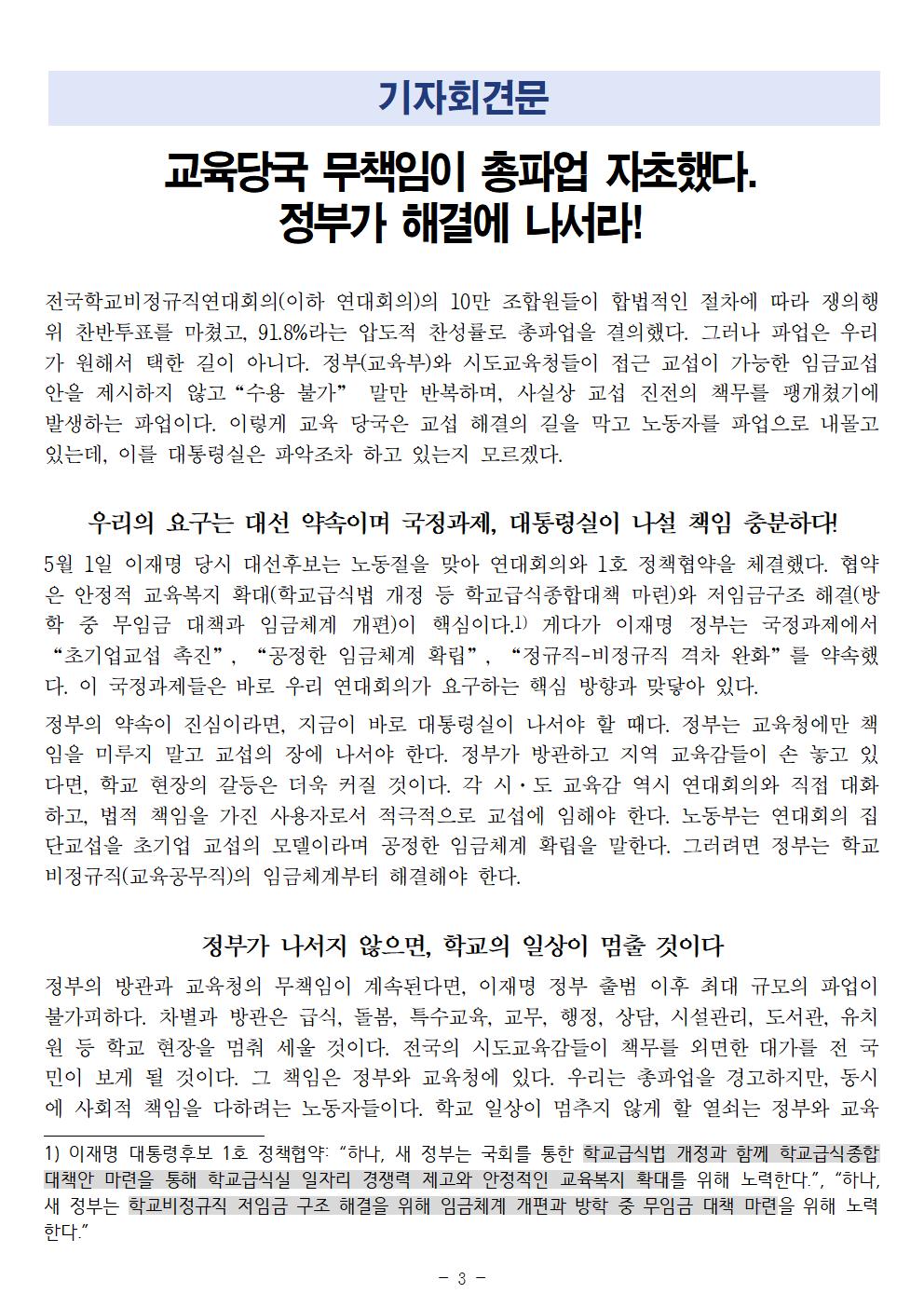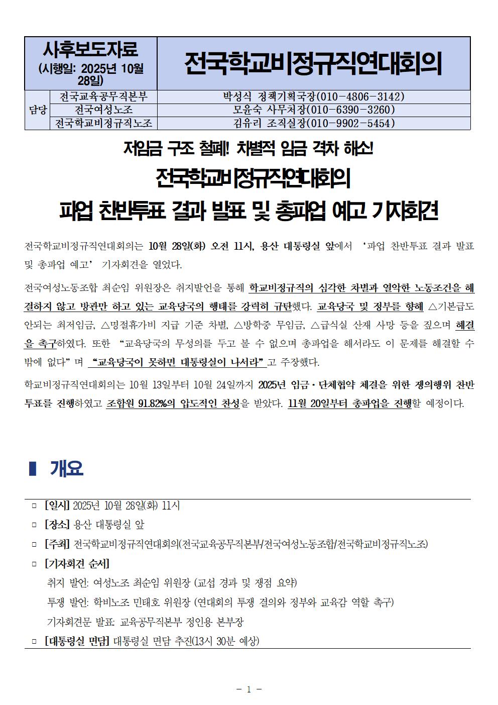 [사후보도자료] 전국학교비정규직연대회의 파업 찬반투표 결과 발표 및 총파업 예고 기자회견
