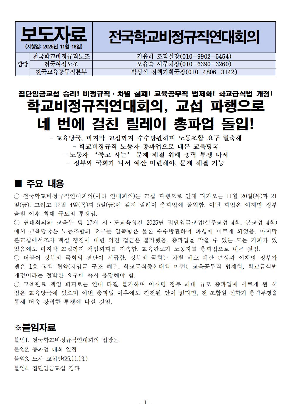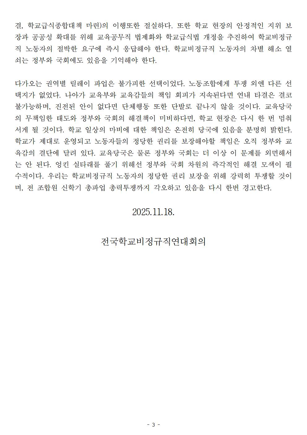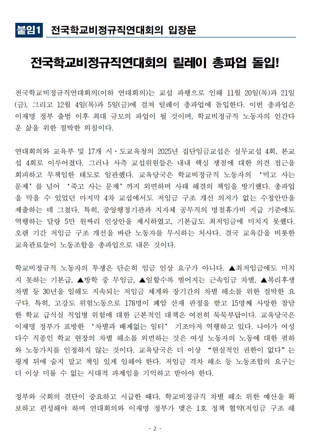 [보도자료] 학교비정규직연대회의, 교섭 파행으로 네 번에 걸친 릴레이 총파업 돌입!