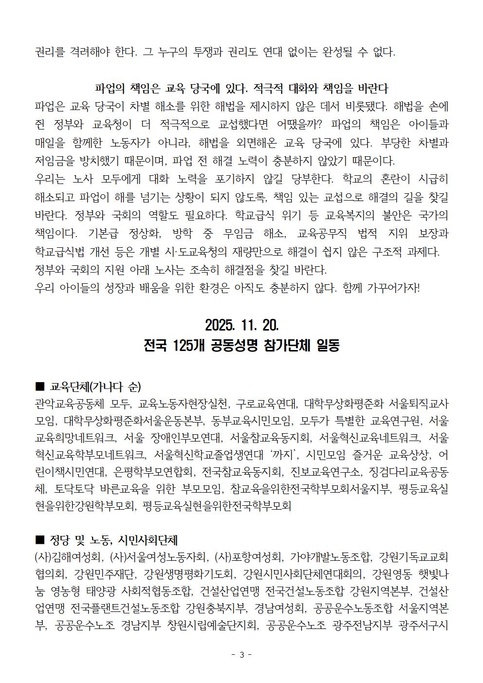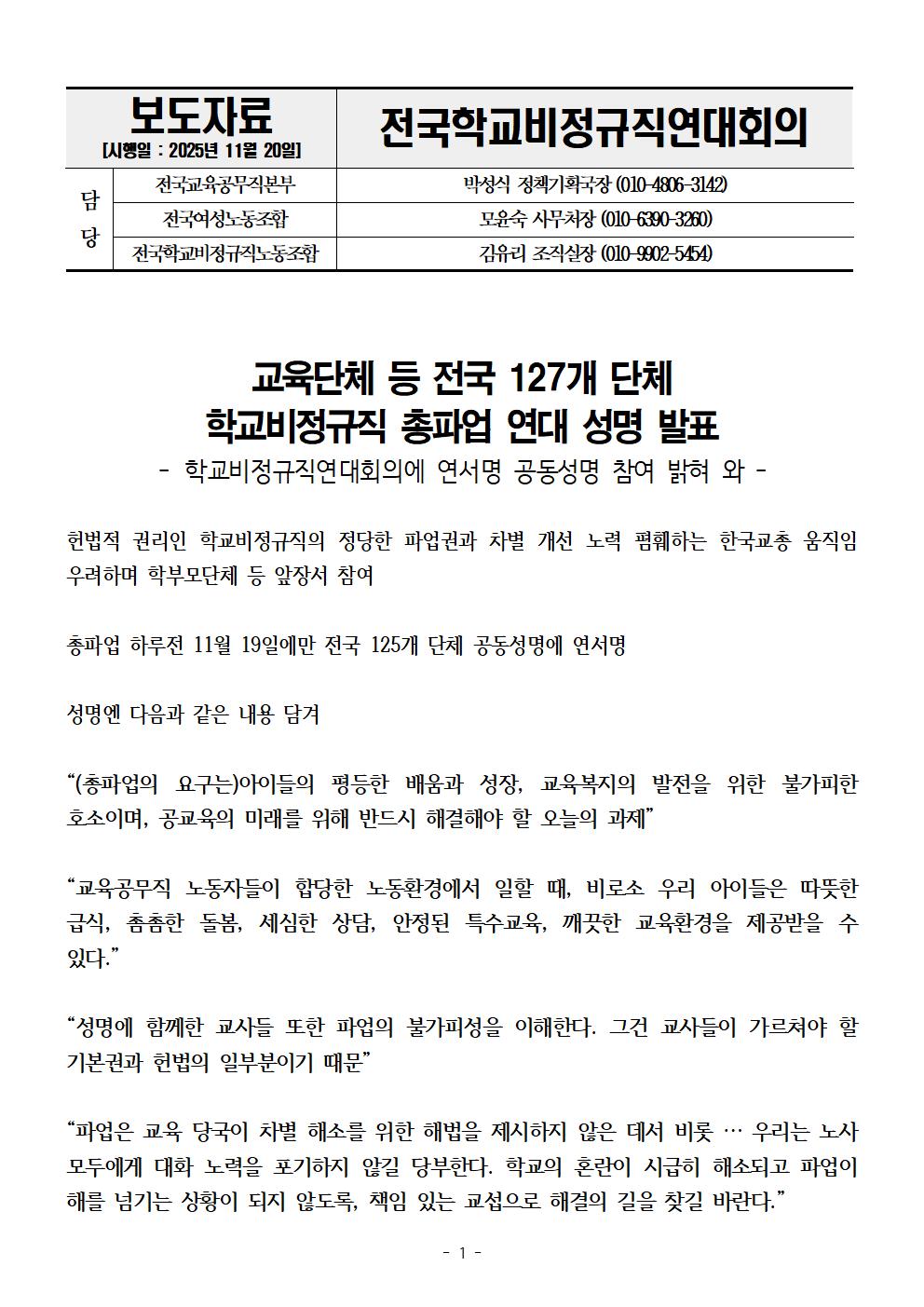 [보도자료] 교육단체 등 전국 127개 단체 학교비정규직 총파업 연대 성명 발표 - 학교비정규직연대회의에 연서명 공동성명 참여 밝혀 와 -