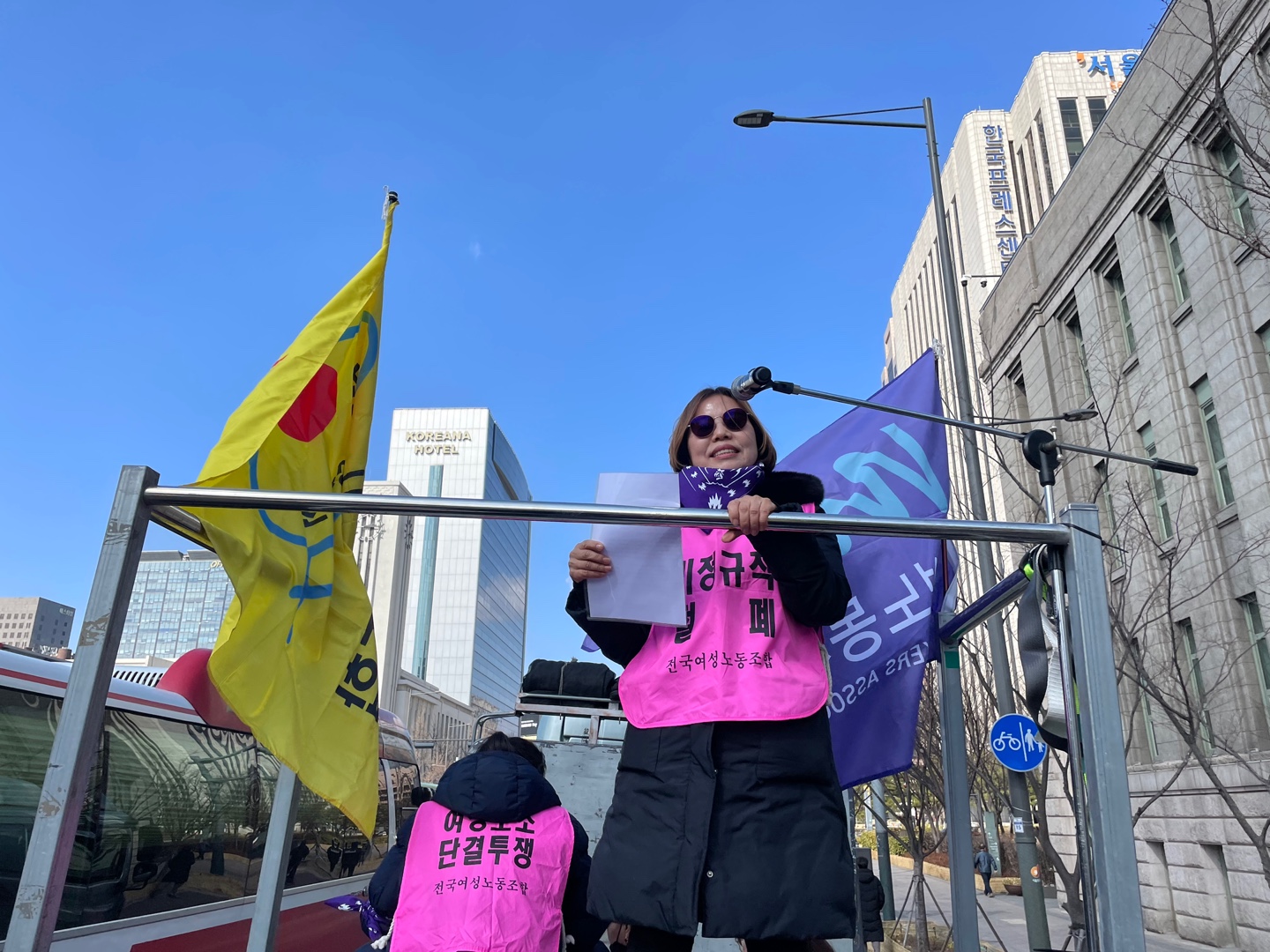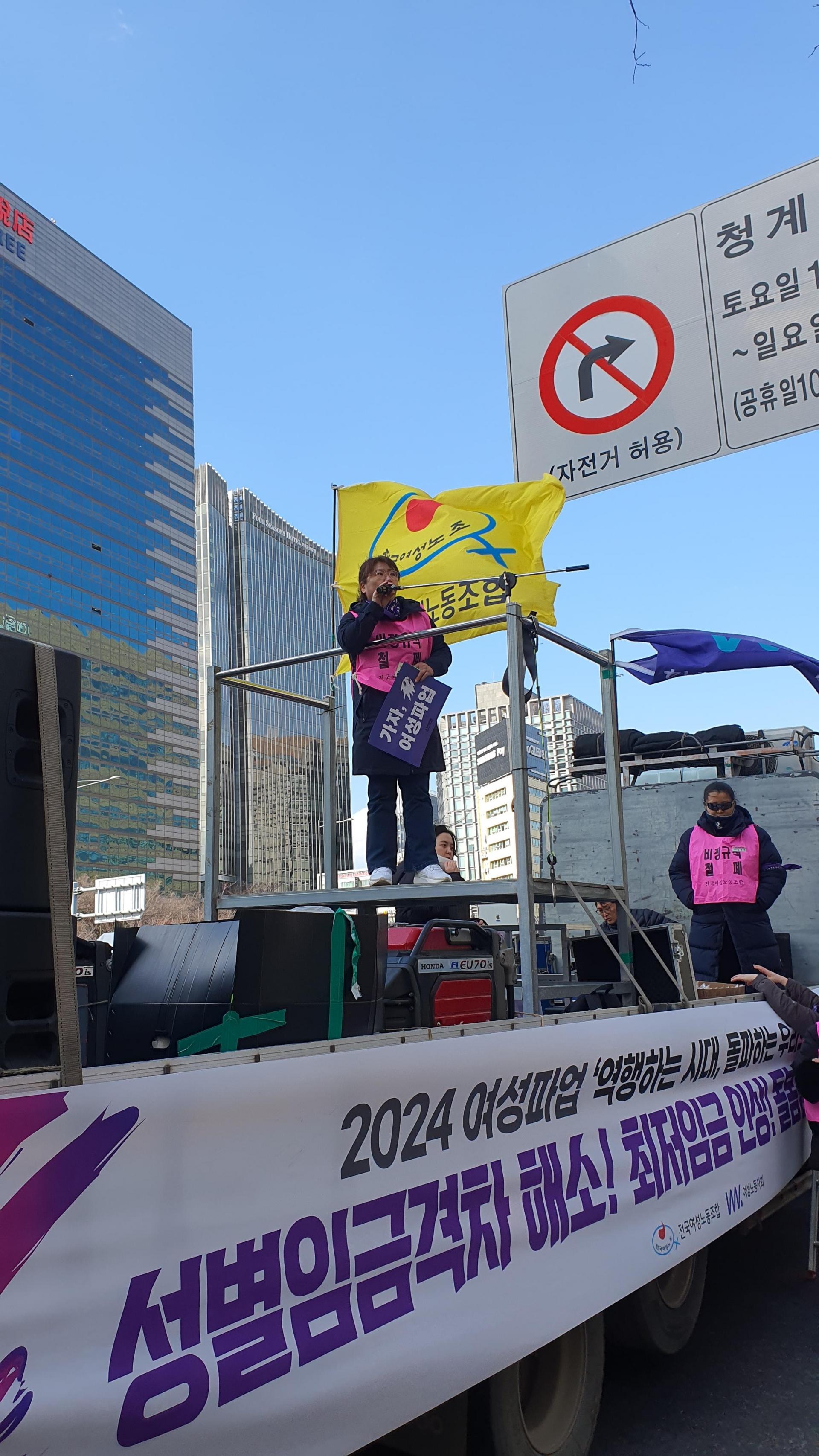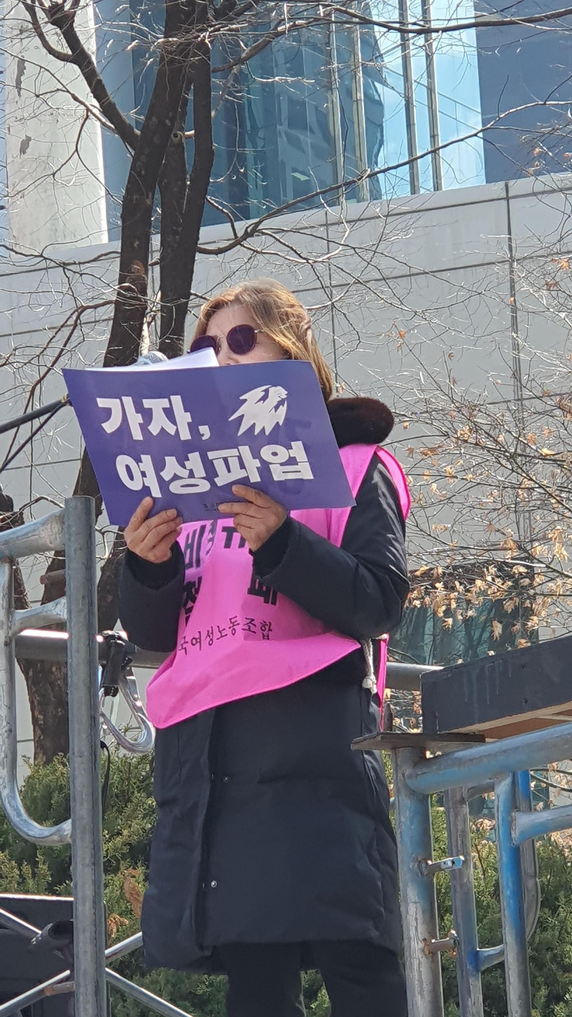 여성파업 본대회에서는 신희숙 전국여성노동조합 인천지부 부지부장님은 청소노동자의 노동현장과 비정규직 여성 노동권에 대해 발언하셨습니다. 본대회가 끝난후 여성노조와 여성노동자회는 청계광장까지 행진을 이어나갔습니다. 행진 중 전북여성노동자회 박은진 사무국장, 전국여성노조 서울지부 서강대분회 윤미순 분회장, 전국여성노조 디지털콘텐츠창작노동자지회 이수경 지회장, 전국여성노조 인천지부 신희숙 부지부장, 전국여성노조 드림파크CC분회 박은영 분회장, 전국여성노조 이진숙 수석부위원장님이 발언을 통해 다양한 여성노동자들의 투쟁의 목소리를 전하며 결의를 다졌습니다.
