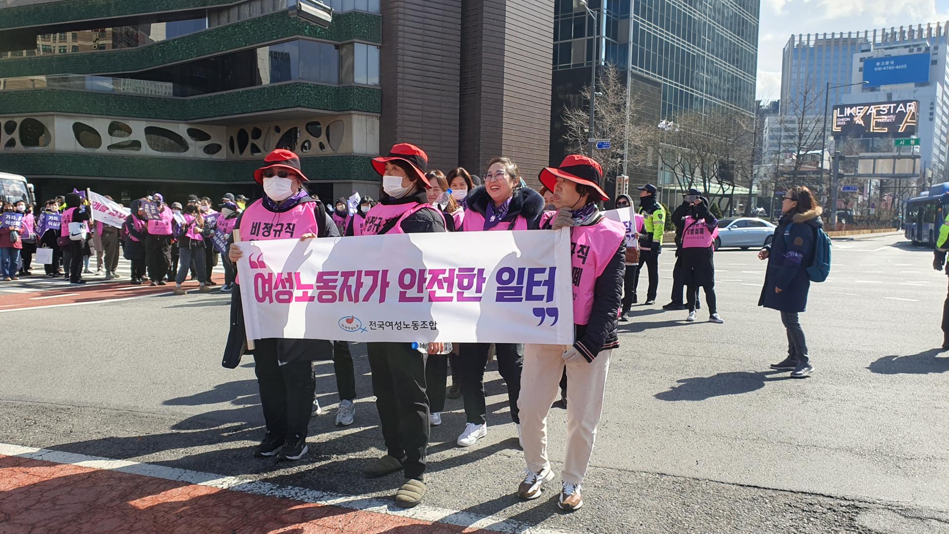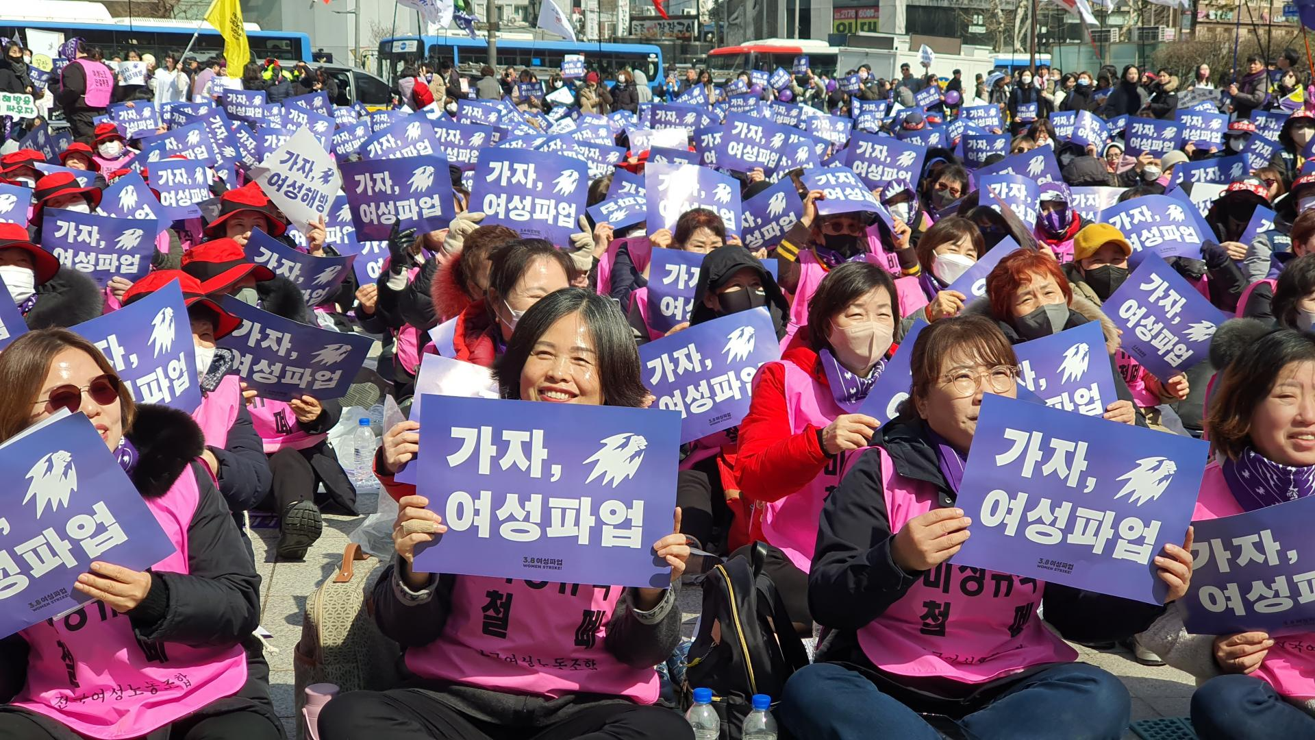 이번 여성파업은 '역행하는 시대, 돌파하는 우리의 투쟁'이라는 슬로건 아래 5개의 요구안 △성별 임금격차 해소 △최저임금 인상 △돌봄 공공성 강화 △일하는 모두의 노동권 보장 △임신중지 건강보험 적용 및 유산유도제 보장을 내걸었습니다.