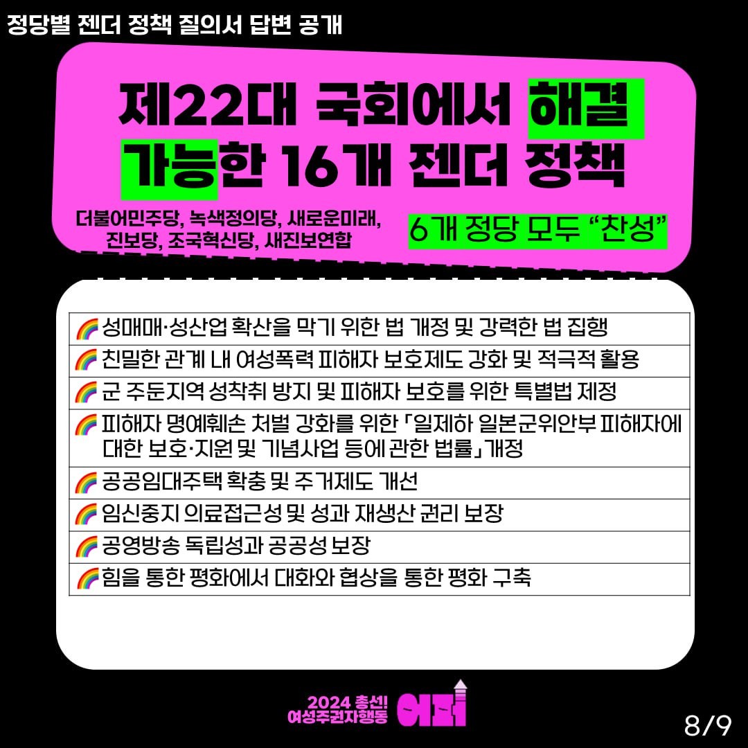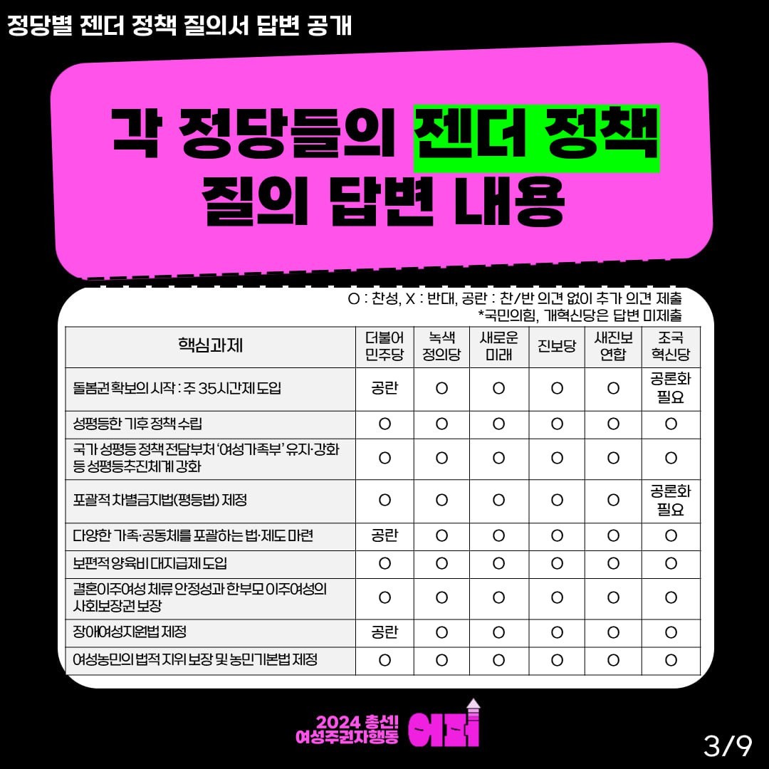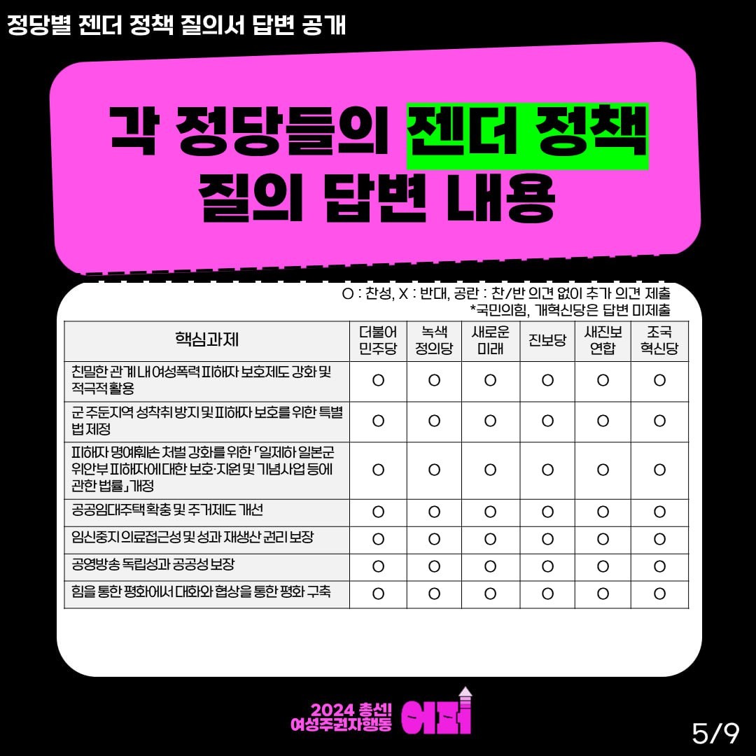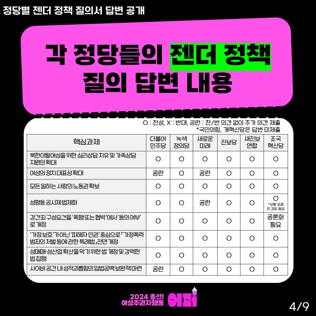 ‘여성 주권자 행동 ‘어퍼’’는 더불어민주당, 국민의힘, 녹색정의당, 새로운미래, 개혁신당, 진보당, 조국혁신당, 새진보연합에 24개 핵심 젠더정책 과제에 대한 공개 질의서를 보냈고, 답변을 제출하지 않은 국민의힘과 개혁신당을 제외한 6개의 정당의 답변 결과를 공개했는데요,